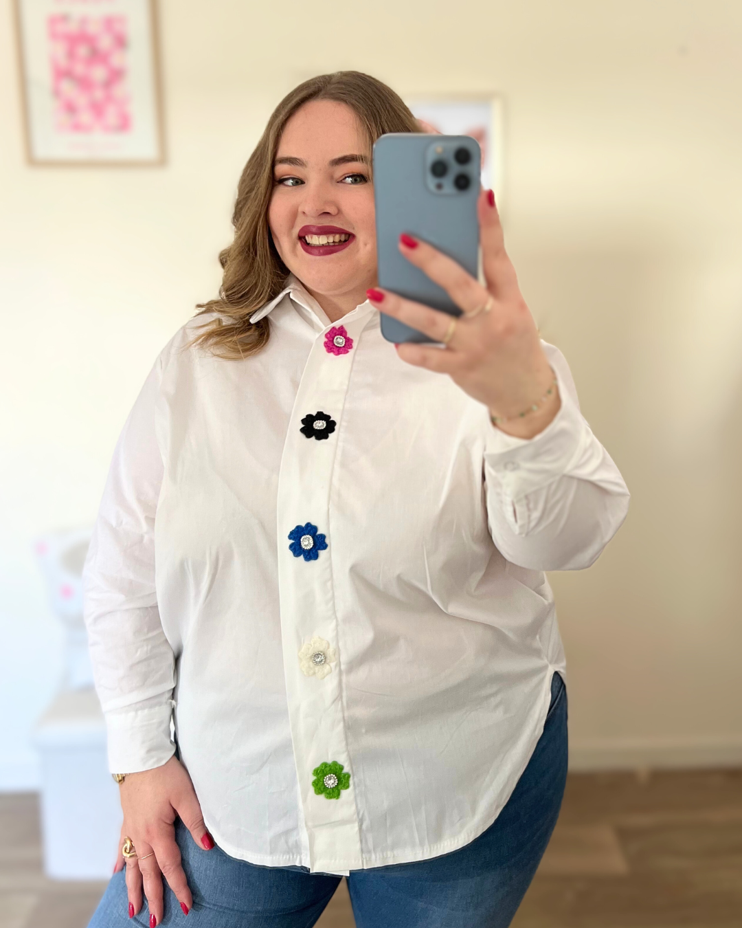 Chemise blanche, avec un detail de fleurs colorées. Strass à l'interieur de la fleur.