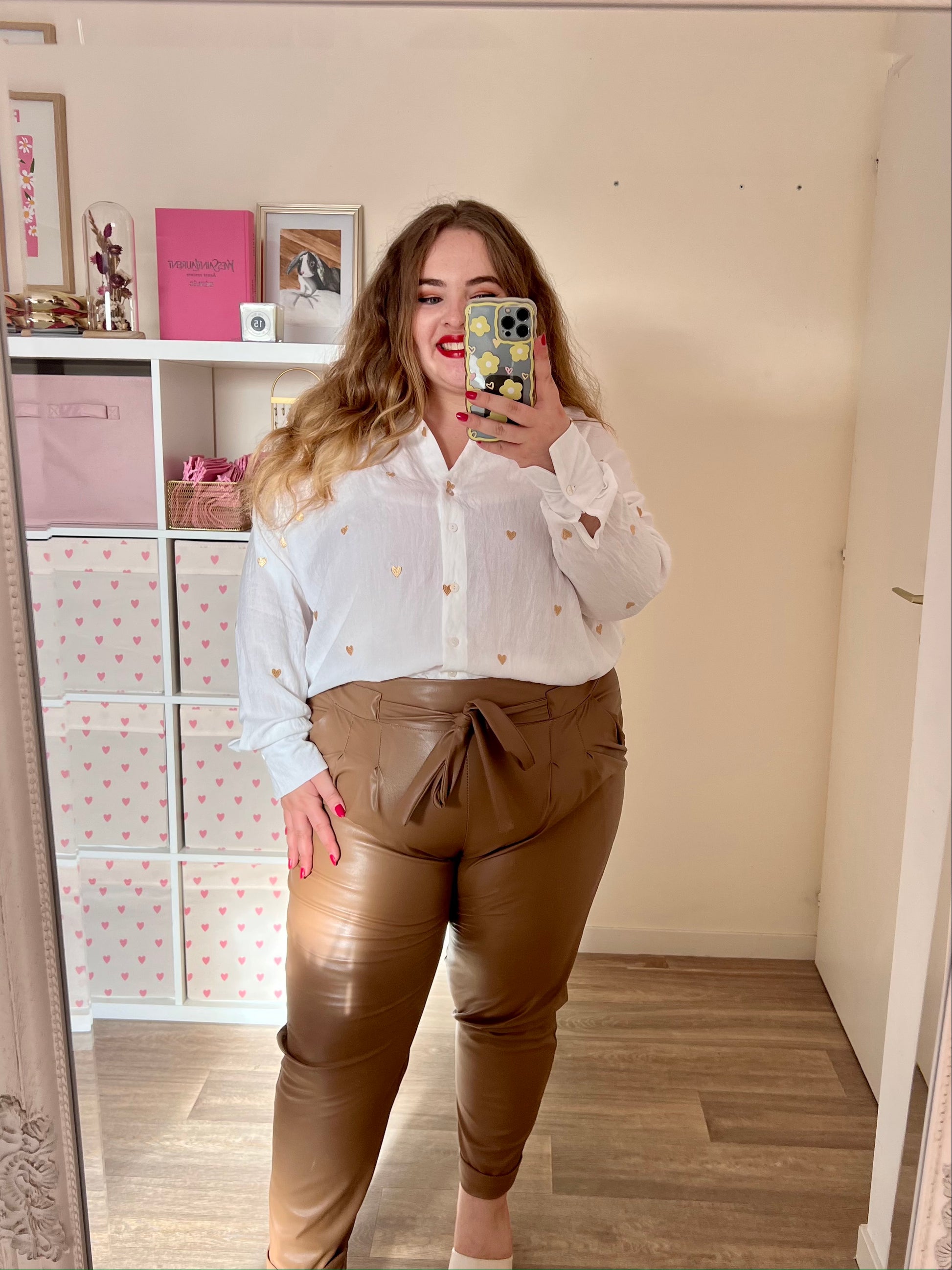 Pantalon marron taille haute en similicuir. (disponible également en noir)