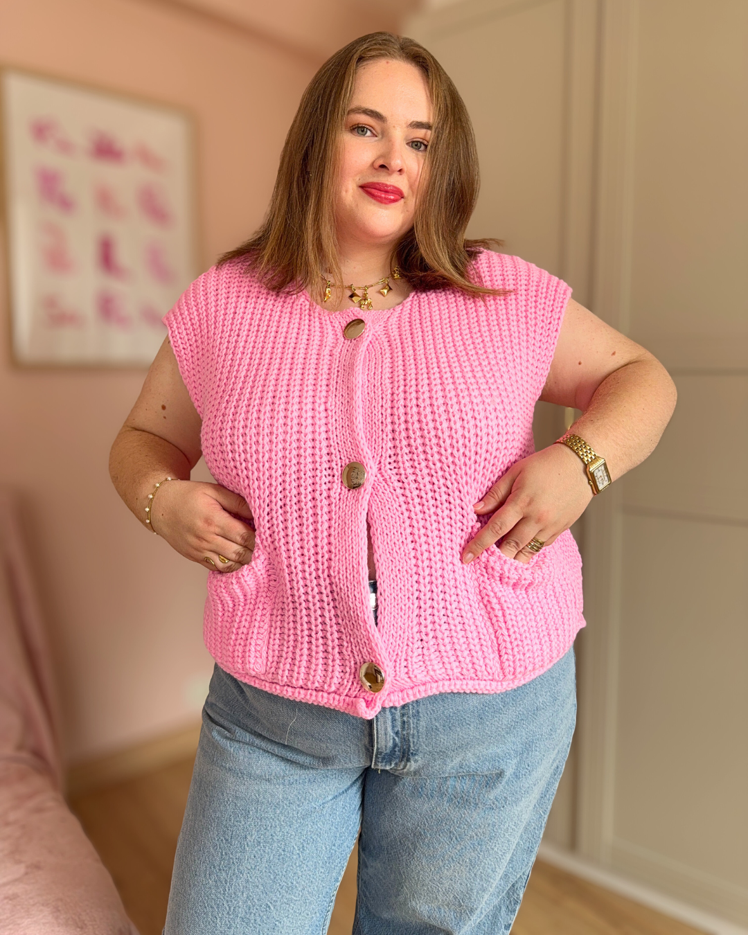 Pull sans manches rose avec boutons dorés